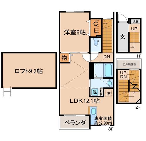 部屋設備:流し台、ガスコンロ設置可、カウンターキッチン、浴室、バストイレ別、シャワー、浴室換気乾燥機、シャンプードレッサー、給湯(追焚き式)、トイレ、温水洗浄便座、洗濯機置場(室内)、ベランダ、フローリング、TVインターホン、下駄箱、冷暖エアコン(2基)、ロフト |